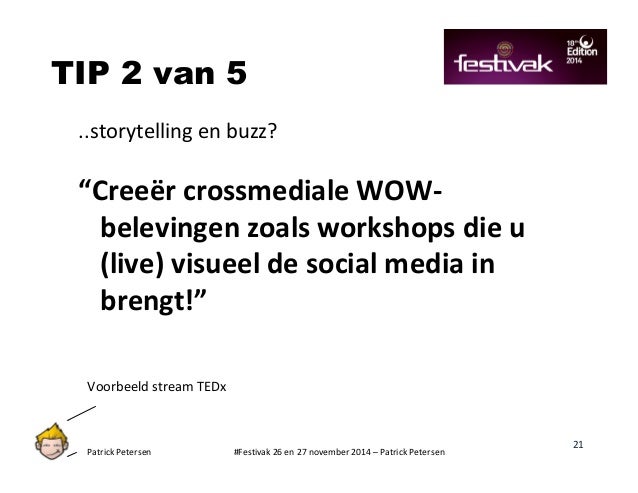14. #Festivak 26 en 27 november Patrick Petersen 2014 – Patrick Petersen 21 TIP 2 van 5 ..storytelling en buzz? “Creeër crossmediale WOW-belevingen zoals workshops die u (live) visueel de social media in brengt!” Voorbeeld stream TEDx