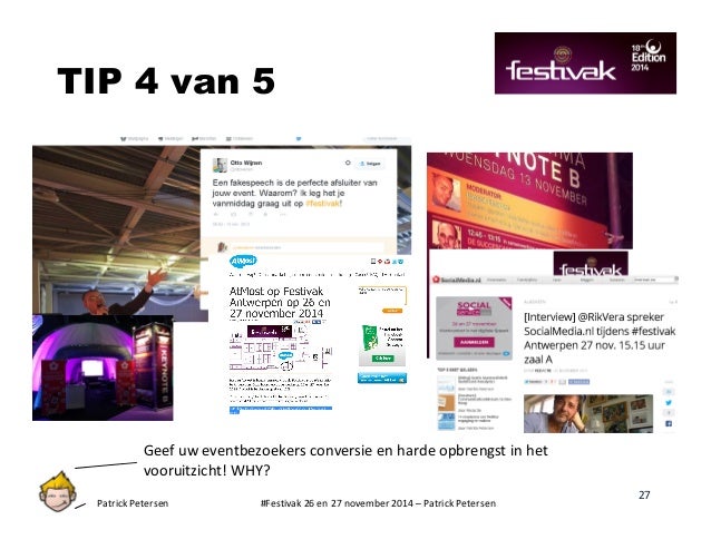 16. #Festivak 26 en 27 november Patrick Petersen 2014 – Patrick Petersen 27 TIP 4 van 5 Geef uw eventbezoekers conversie en harde opbrengst in het vooruitzicht! WHY?