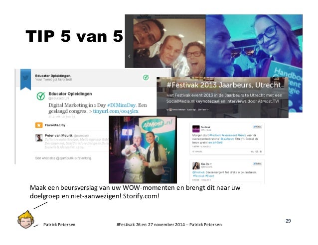 17. #Festivak 26 en 27 november Patrick Petersen 2014 – Patrick Petersen 29 TIP 5 van 5 Maak een beursverslag van uw WOWmomenten en brengt dit naar uw doelgroep en nietaanwezigen! Storify.com!