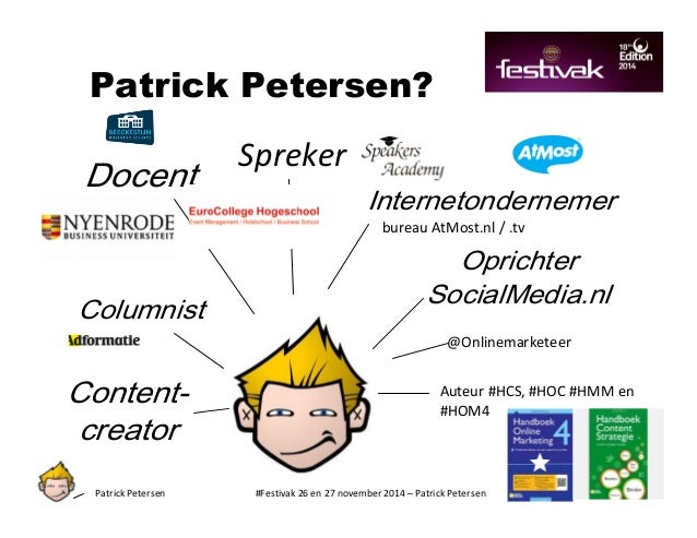2. Patrick Petersen? Docent Internetondernemer bureau AtMost.nl / .tv Oprichter SocialMedia.nl @Onlinemarketeer Auteur #HCS, #HOC #HMM en #HOM4 Spreker Columnist Content-creator #Festivak 26 en 27 november Patrick Petersen 2014 – Patrick Petersen