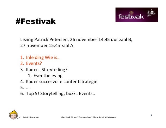 5. #Festivak 26 en 27 november Patrick Petersen 2014 – Patrick Petersen 5 #Festivak Lezing Patrick Petersen, 26 november 14.45 uur zaal B, 27 november 15.45 zaal A 1. Inleiding Wie is.. 2. Events? 3. Kader.. Storytelling? 1. Eventbeleving 4. Kader succesvolle contentstrategie 5. …. 6. Top 5! Storytelling, buzz.. Events..